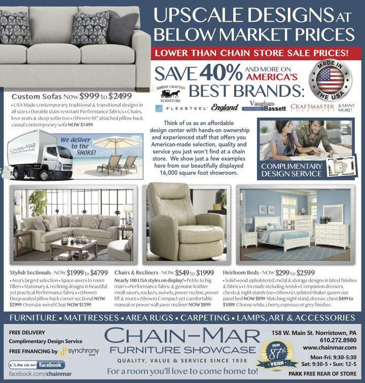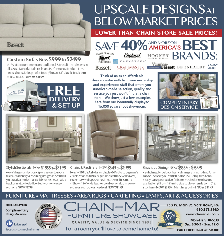 Since 1938 Chain-Mar Furniture Showcase has served the Delaware Valley with an old school, full service approach to selling affordably priced quality home furnishings. We offer a truly unique experience compared to the big box chain stores. We're friendly, knowledgeable and helpful. We provide free professional room planning and custom ordering as well as free delivery and in-room set up. Simply put, you'll love the way we do business! Visit our beautifully appointed 16,000 square foot showroom to see how we can help make your home a beautiful place you'll love to come home to.