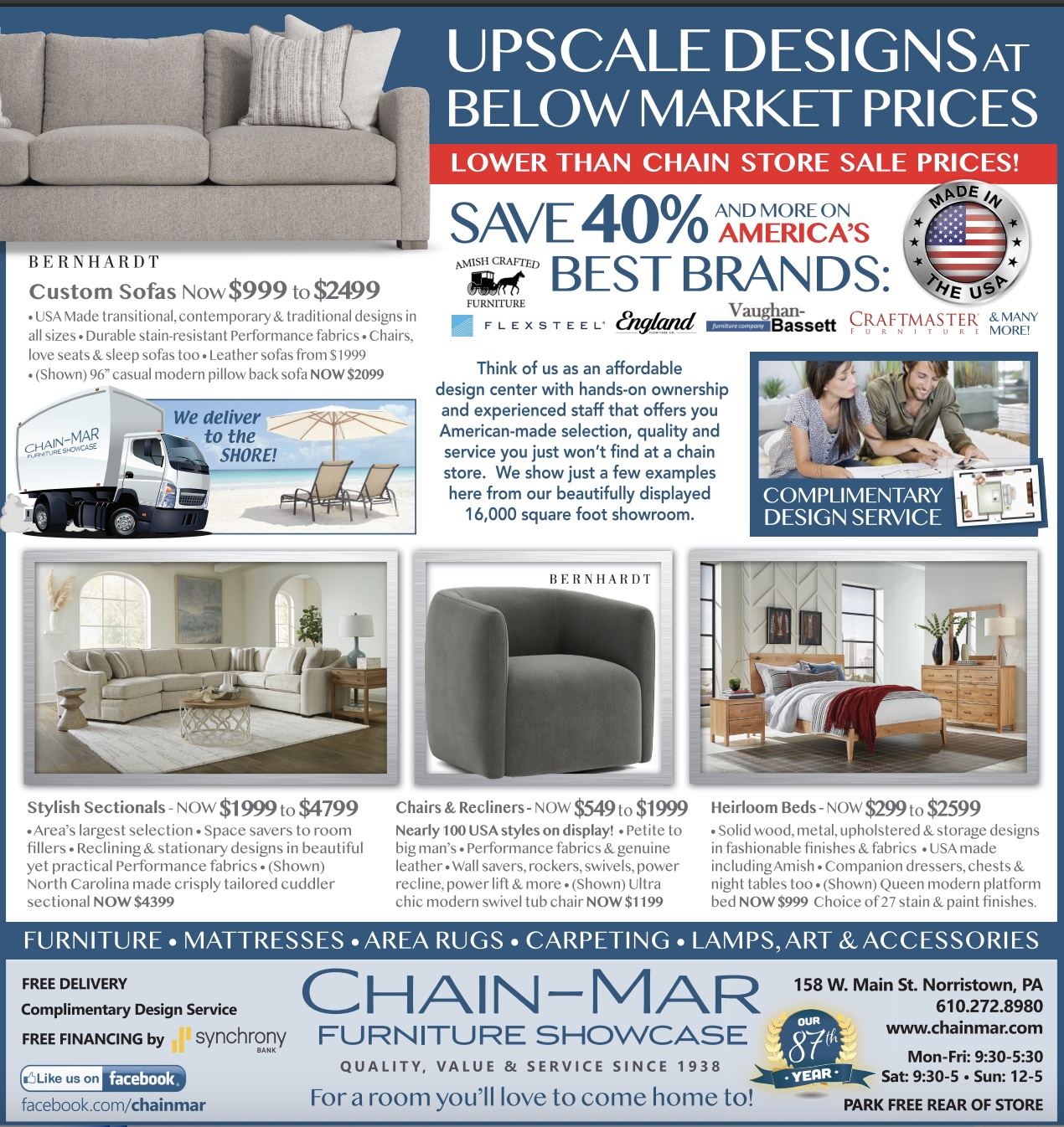 Since 1938 Chain-Mar Furniture Showcase has served the Delaware Valley with an old school, full service approach to selling affordably priced quality home furnishings. We offer a truly unique experience compared to the big box chain stores. We're friendly, knowledgeable and helpful. We provide free professional room planning and custom ordering as well as free delivery and in-room set up. Simply put, you'll love the way we do business! Visit our beautifully appointed 16,000 square foot showroom to see how we can help make your home a beautiful place you'll love to come home to.